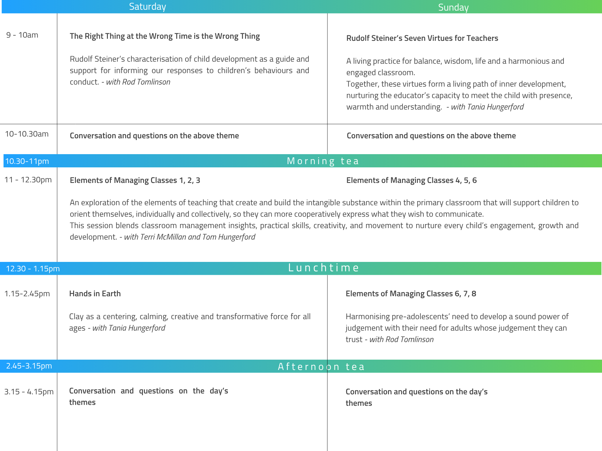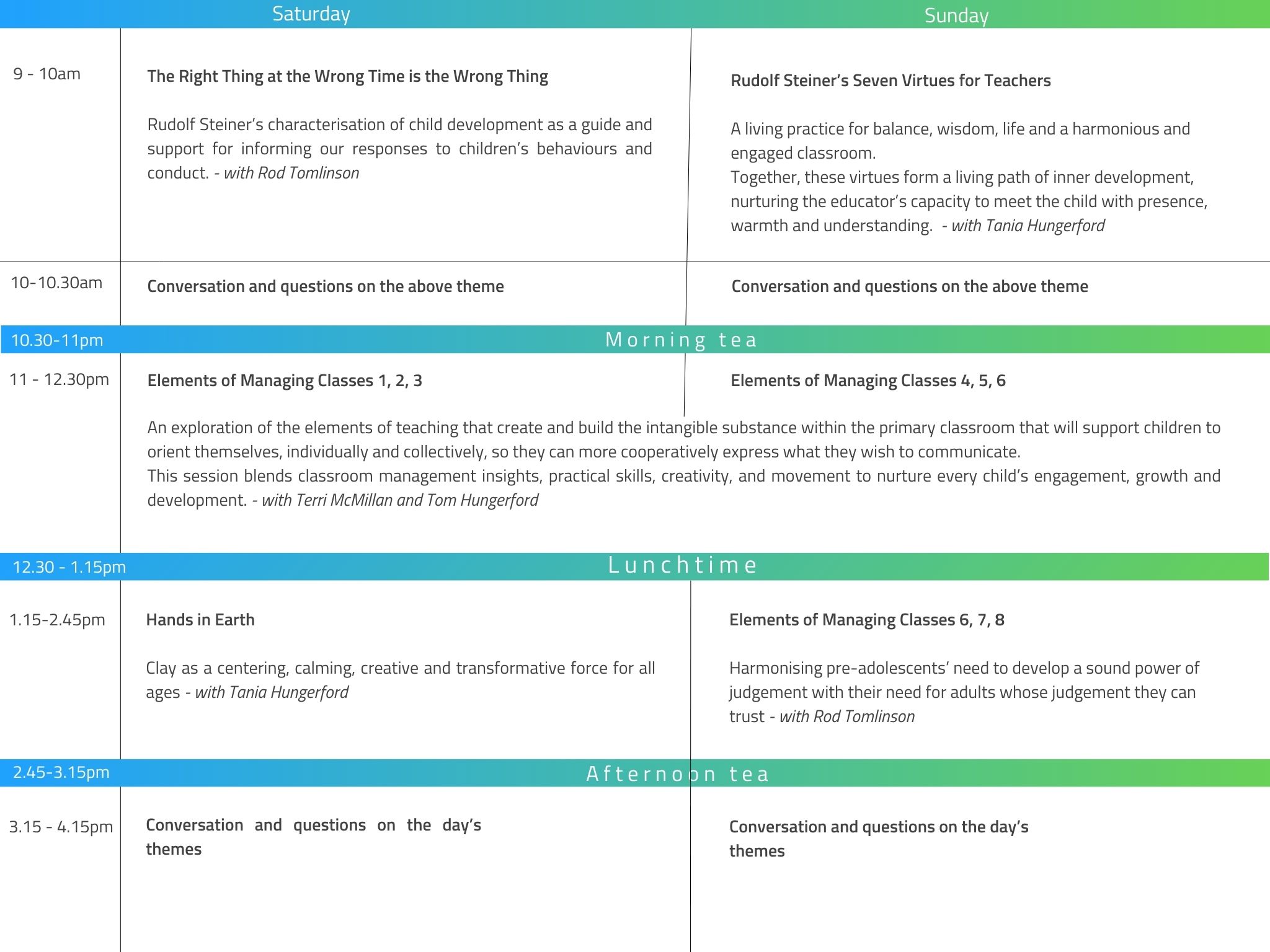 Throughout the weekend, we will work in a supportive and collegial atmosphere where you can share experiences, reflect on challenges, and engage in meaningful conversation about the realities of today’s classroom. Our hope is that you will leave with renewed insight, confidence, and inspiration to continue building a healthy and harmonious learning environment.