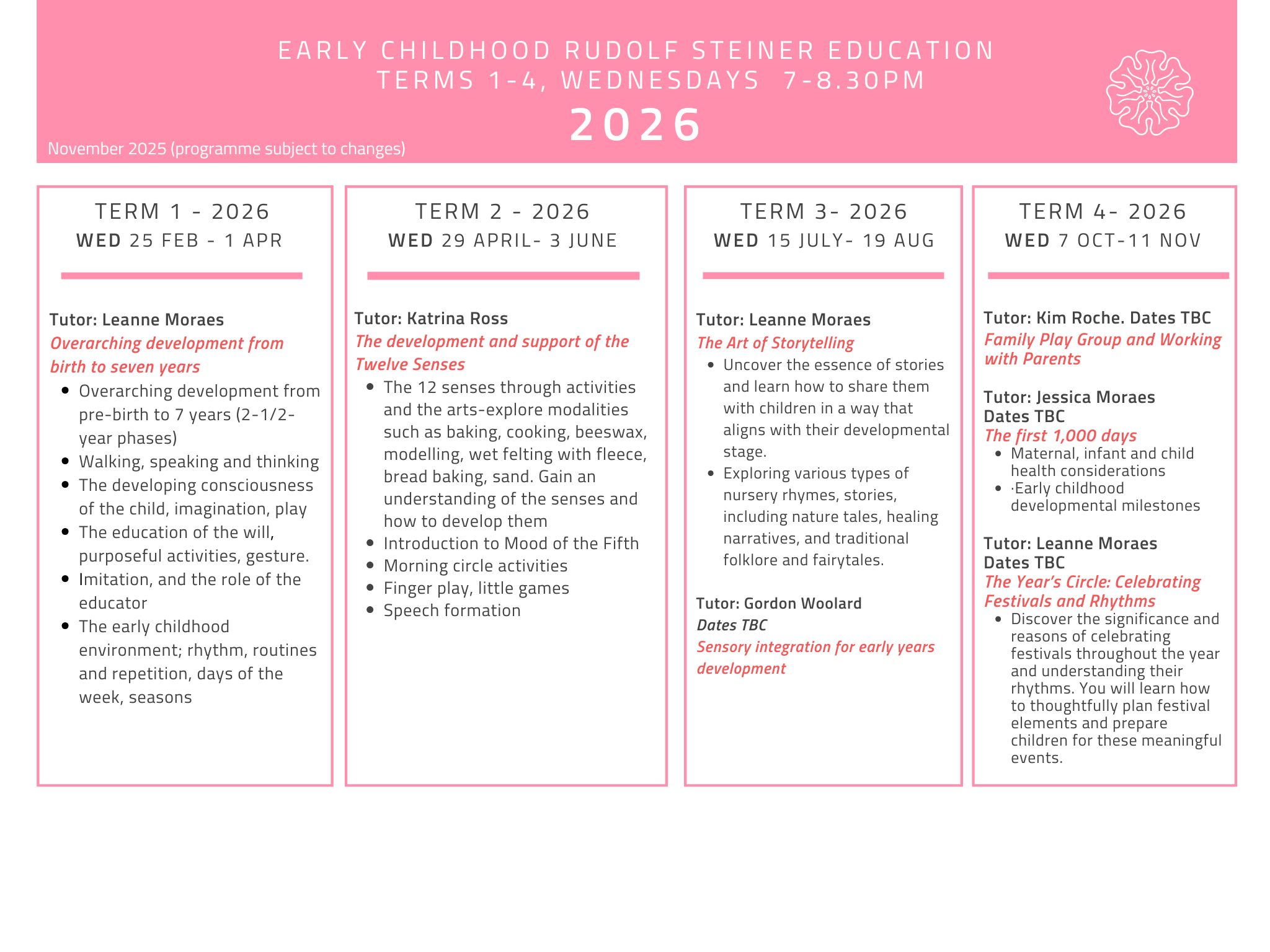 The online course will be live-streamed, allowing you to engage directly with the tutors, who are very experienced Early Childhood Steiner / Waldorf teachers. It will also be recorded for later viewing.